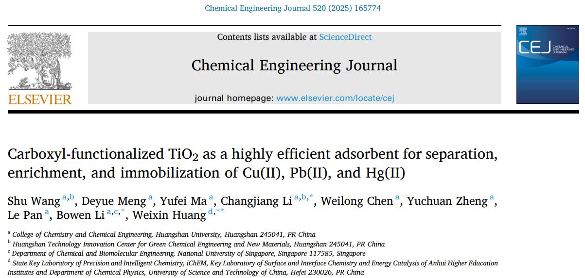 我校化学化工学院教师王澍、李长江与我校优秀校友李博文博士(新加坡国立大学研究员)以及中国科学技术大学黄伟新教授合作,在工程技术领域权威Top期刊《Chemical Engineering Journal》(中科院1区,IF=13.2)发表了题为“Carboxyl-functionalized TiO2 as a highly efficient adsorbent for separation, enrichment, and immobilization of Cu(II), Pb(II), and Hg(II)”的科研论文。