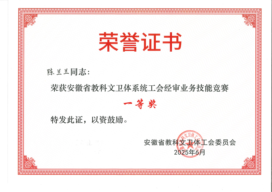 近日,安徽省教科文卫体系统工会经审业务技能竞赛在安徽理工大学圆满落幕。我校审计处陈兰兰老师凭借扎实的专业功底,从全省近60名经审业务骨干中脱颖而出,荣获竞赛一等奖。