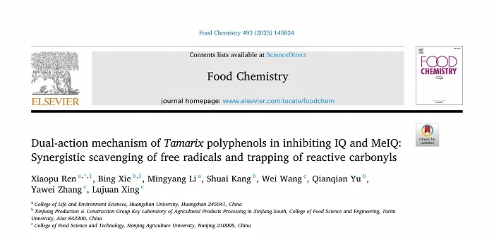 近日,我校生命与环境科学学院任晓镤、李明杨两位老师的科研论文,在工程技术领域权威Top期刊《Food Chemistry》(中科院1区,IF=9.8)发表。论文题为“Dual-action mechanism of Tamarix polyphenols in inhibiting IQ and MeIQ: Synergistic scavenging of free radicals and trapping of reactive carbonyls(红柳多酚通过清除自由基与捕获活性羰基的双重作用机制抑制杂环胺IQ和MeIQ的形成)”,黄山学院为第一署名单位,任晓镤担任第一作者和通讯作者。该研究获国家自然科学基金项目、安徽省高校优秀青年教师培育重点项目及黄山学院科研启动基金等多方资助。