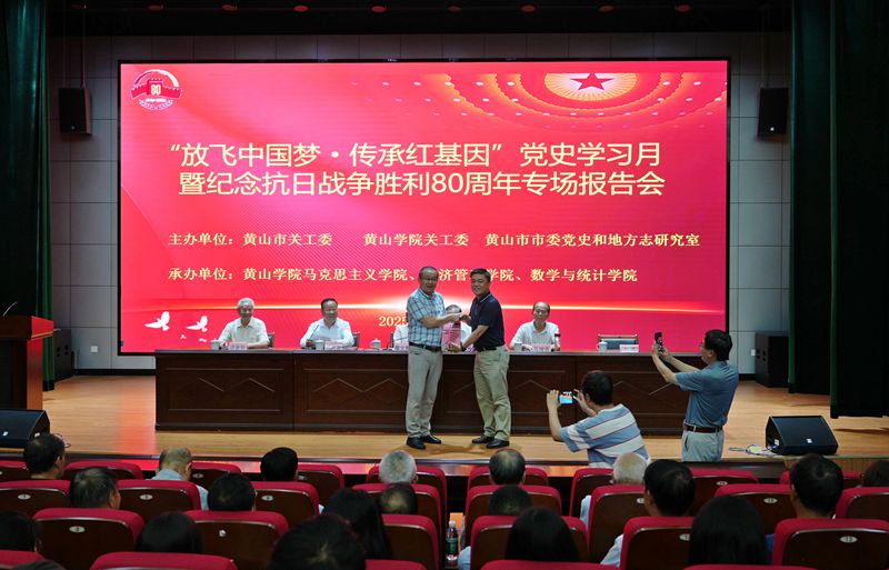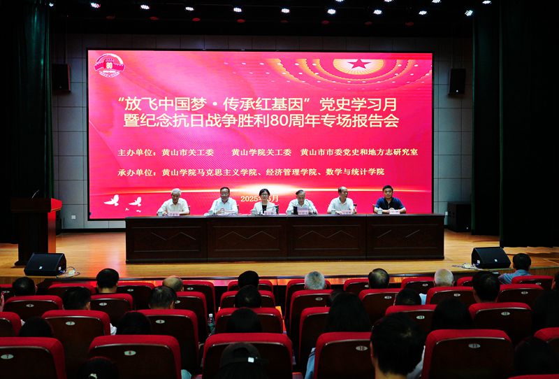 6月13日下午,“放飞中国梦•传承红基因”党史学习月暨纪念抗日战争胜利80周年专场报告会在我校横江校区报告厅举行。校党委副书记、关工委主任章文静,黄山市关工委主任叶枝光出席活动。会议由校关工委常务副主任汪良发主持。