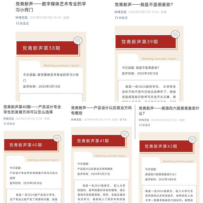 6月,体育部号召学生参与运动青春打卡活动征集运动打卡视频60余份;新媒体中心推出党青新声专栏解答专业问题10余个;志愿中心收集整理各专业学霸专业笔记,开展学霸养成计划分享实用应试技巧;青年之家开展书香传情活动循环利用书籍300余册。