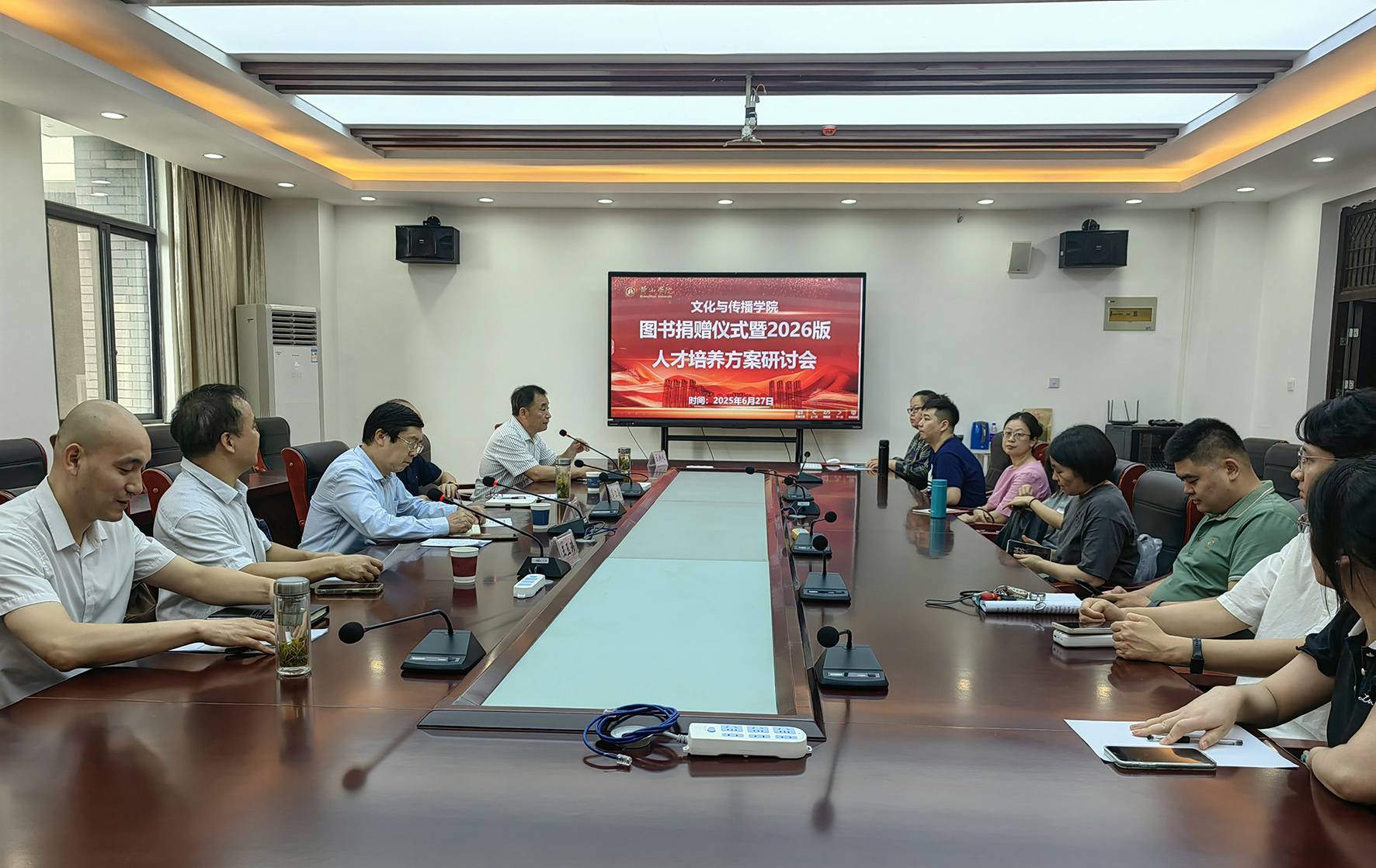 6月27日,文化与传播学院在文澜楼320会议室举办2026版人才培养方案研讨会暨新闻作品图书捐赠仪式。安徽日报驻黄山记者站原站长、高级记者吴江海,黄山日报社党委书记、总编辑吴顺辉,暨南大学新闻与传播学院教授、博士生导师王玉玮,文化与传播学院部分教师等出席研讨会。活动由文化与传播学院党委书记路善全主持。