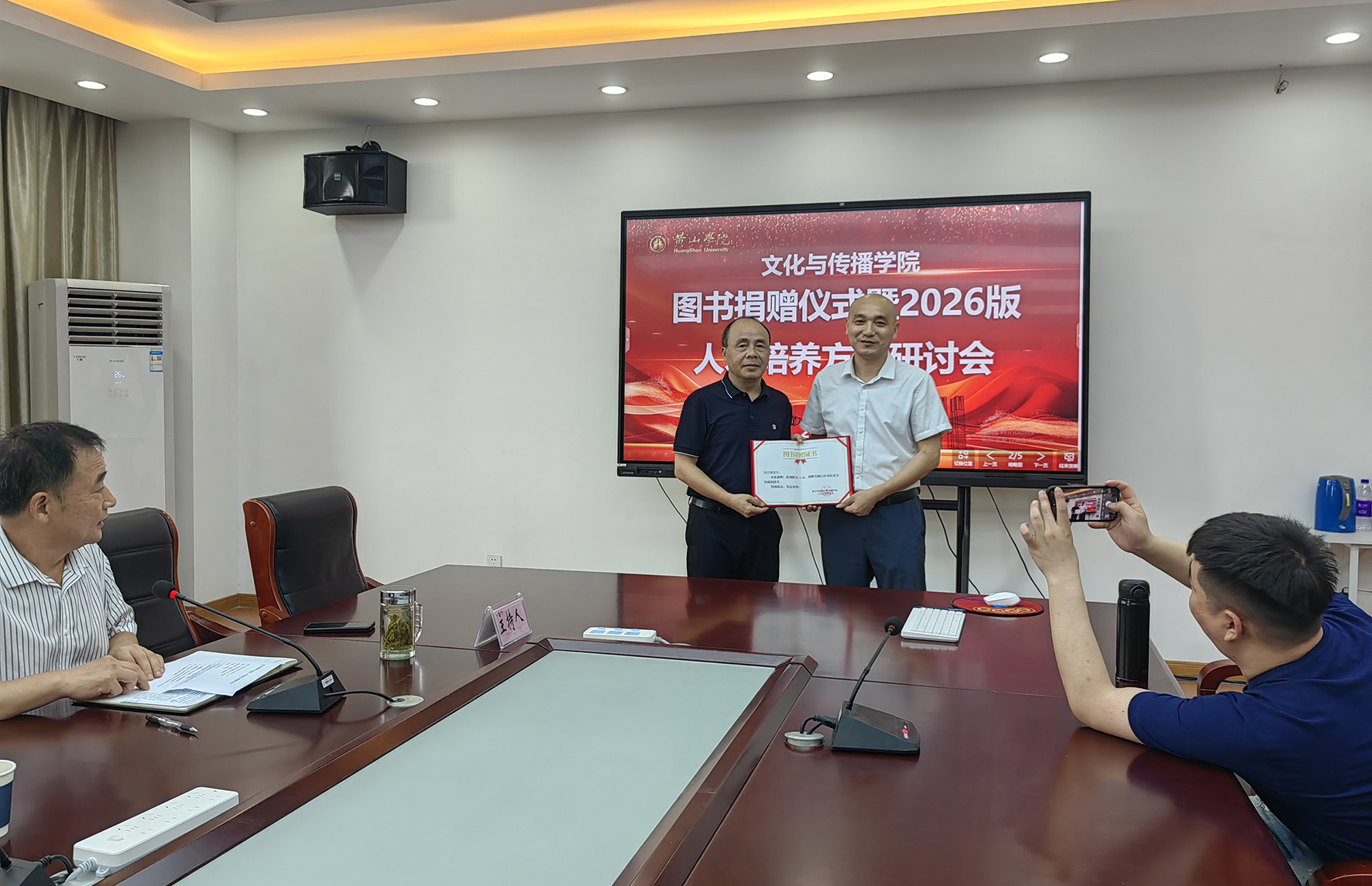 捐赠仪式上,吕正兵代表文化与传播学院为吴江海颁发捐赠证书。吴江海向文化与传播学院捐赠1008本新闻作品集《看黄山》,作为师生研究与学习的创作案例。该作品集收入了吴江海本人2007年至2017年期间在《安徽日报》《新安晚报》刊发的通讯报道。作品集分“美丽黄山”“富裕黄山”“文明黄山”三大部分,详细记录了10年间黄山市改革发展的历程,是一部有思想、有温度、有品质的优秀新闻作品集。