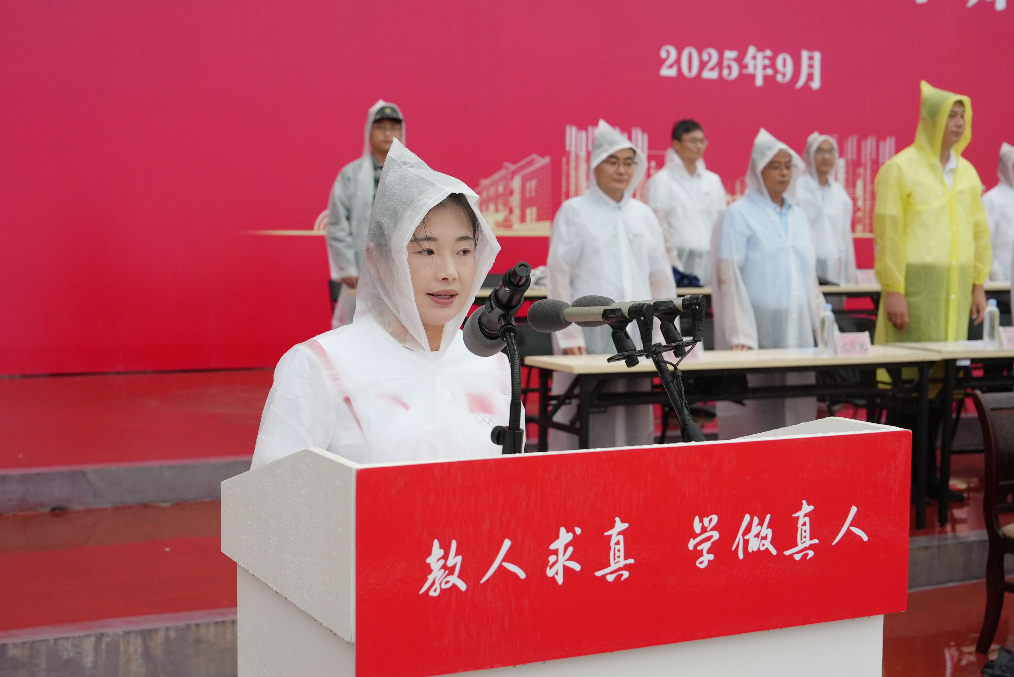 典礼上,校党委副书记、院长李庆宏向承训部队授军训团团旗。雨水浸润的旗帜愈加鲜红,仿佛昭示着新生们将在磨砺中绽放的青春底色。他代表学校向全体新生表示热烈欢迎,向辛勤培育他们的家长和老师致以衷心感谢,并向承担军训任务的全体教官表示崇高敬意。适逢第41个教师节,李庆宏同时向全校教师和教育工作者送上节日祝福。