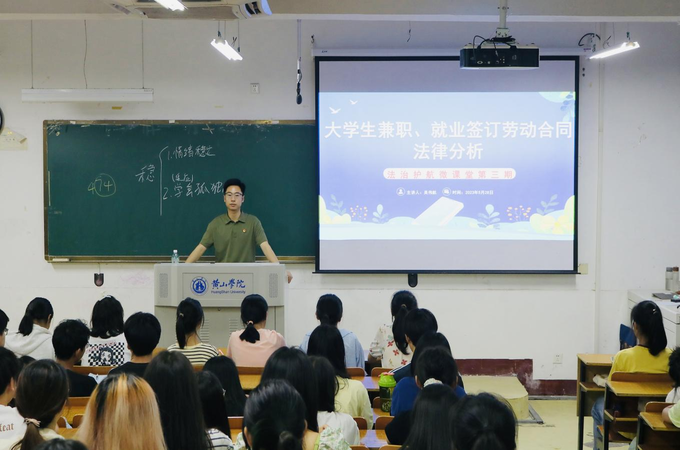 这堂及时又实用的普法课,正是我校“法治微课堂”特色育人品牌的生动缩影。该品牌由学校辅导员携手黄山市政法部门骨干力量共同打造,摒弃传统法律课堂的条文说教模式,以鲜活真实的案例为切入点,精准聚焦大学生成长路上的法律需求。课堂形式丰富多样,情景模拟让学生沉浸式感受法律应用场景,互动问答点燃大家的参与热情,案例分析帮助学生理清法律逻辑,原本晦涩难懂的法律知识被转化为通俗易懂的生活指南。