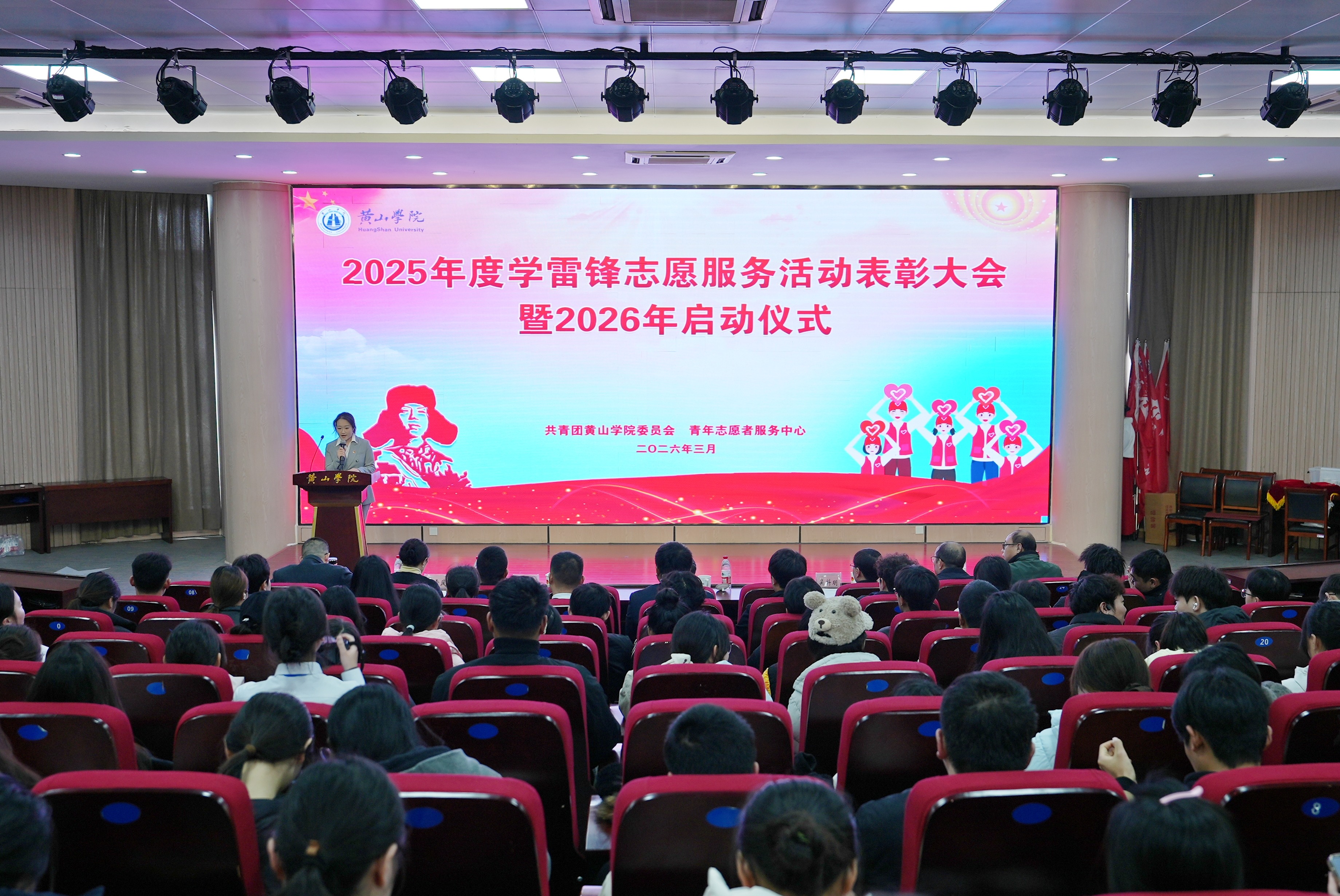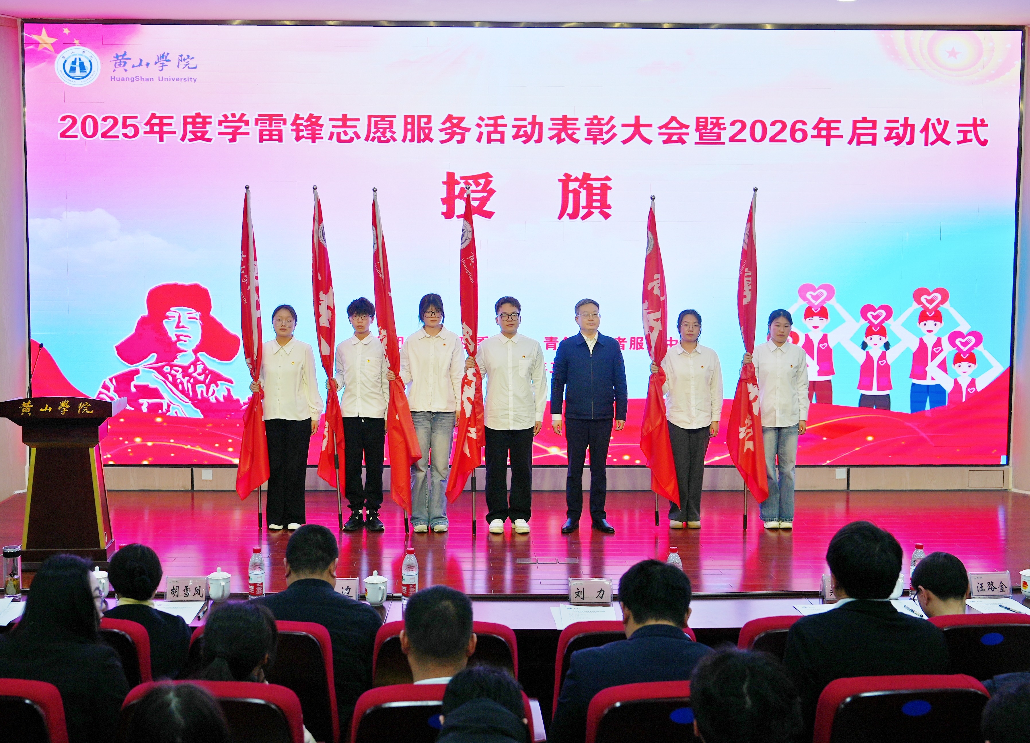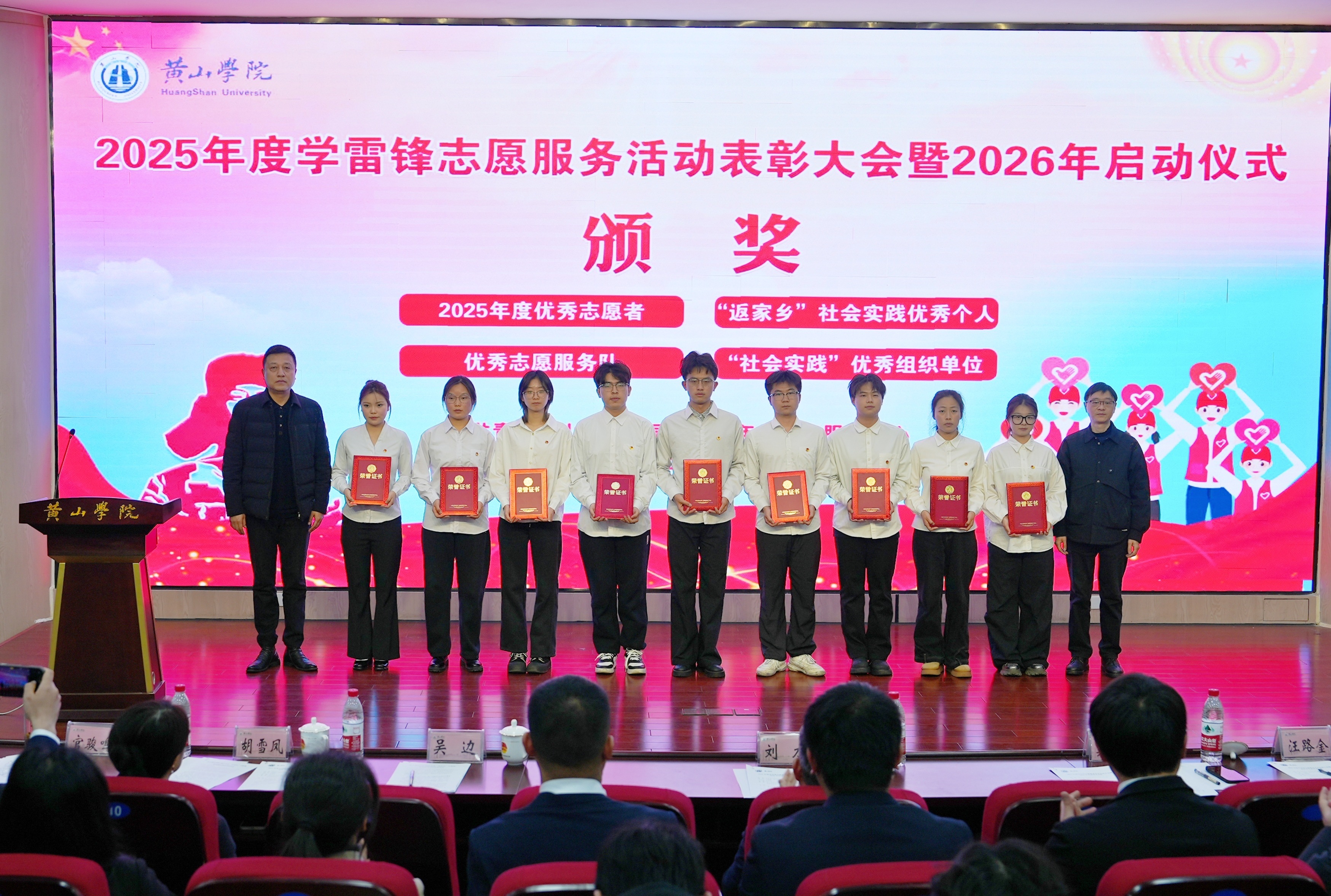 党委(院长)办公室负责人宣读《关于黄山学院2025年度“学雷锋”志愿服务实践活动的表彰决定》。校领导和各部门负责人为2025年度优秀志愿者、“返家乡”社会实践优秀个人、优秀志愿服务队、“社会实践”优秀组织单位颁奖。