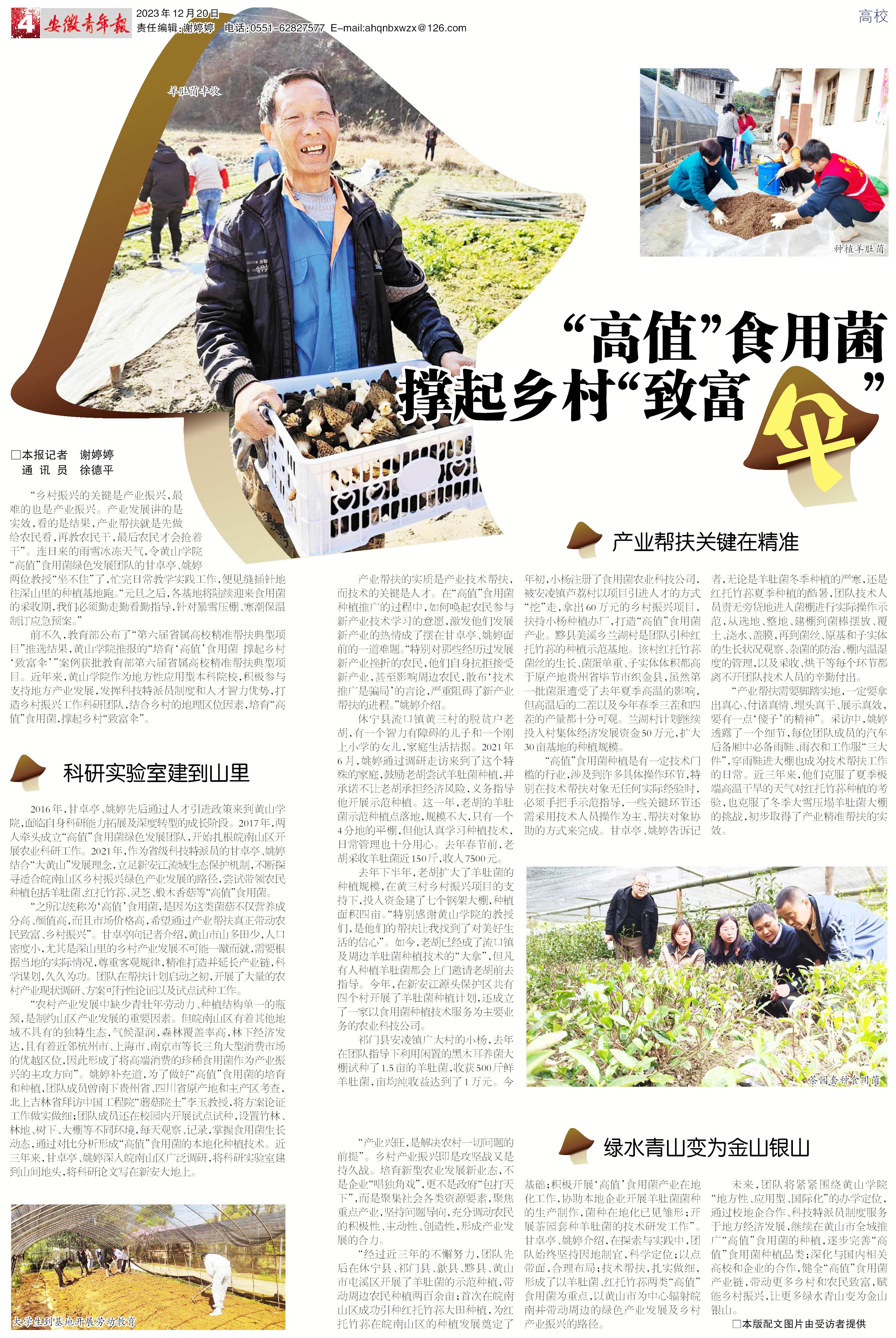 12月20日,《安徽青年报》以《“高值”食用菌撑起乡村“致富伞”》为题,以甘卓亭、姚婷团队为典型,整版深度报道我校充分发挥高校人才资源的智库作用,以实际动赋能乡村产业振兴的工作成效。