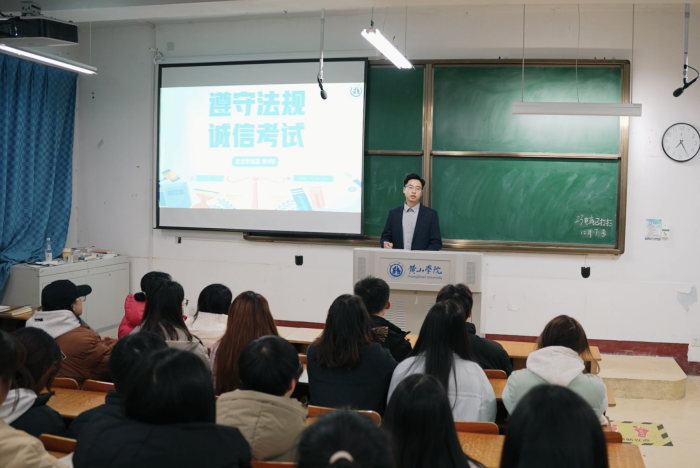专职辅导员吴伟航结合大学生考试违纪、作弊真实案例强调了《黄山学院全日制学生考试工作管理规定》对于大学生考试违规行为的认定与处理。此外,带领大家认真学习了《中华人民共和国教育法》《中华人民共和国刑法修正案(九)》《国家教育考试违规处理办法》《最高人民法院、最高人民检察院关于办理组织考试作弊等刑事案件适用法律若干问题的解释》中有关国家教育考试违纪、作弊的认定及处理办法(节选)。帮助同学们了解学习国家法律法规和学校考试管理关于考试工作的相关规定,有助于全面提升大学生的法律素养和法治观念,将依法治考、诚信参考的行为深度融合并贯穿考试全过程。