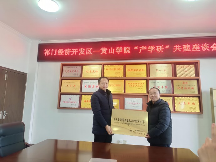 吕海江向祁门经开区领导介绍了学院正在进行的校企合作项目申报与建设,表示校企合作要持续深入开展。吴克勤介绍了祁门县经济开发区园区的建设情况,他表示园区非常支持与黄山学院的“产学研”建设,并表示说企业的发展十分重要的一环就是与高校的产学研建设。此次还进行了安徽省功率半导体集成电路过程研究中心(筹)的合作单位揭牌仪式。