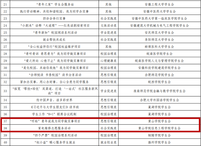 近日,2023年度安徽省高校学生会组织“我为青年做实事”项目名单发布,我校“‘听松’青年说我为青年做实事”和“家电维修志愿服务项目”2个项目获评优秀项目。