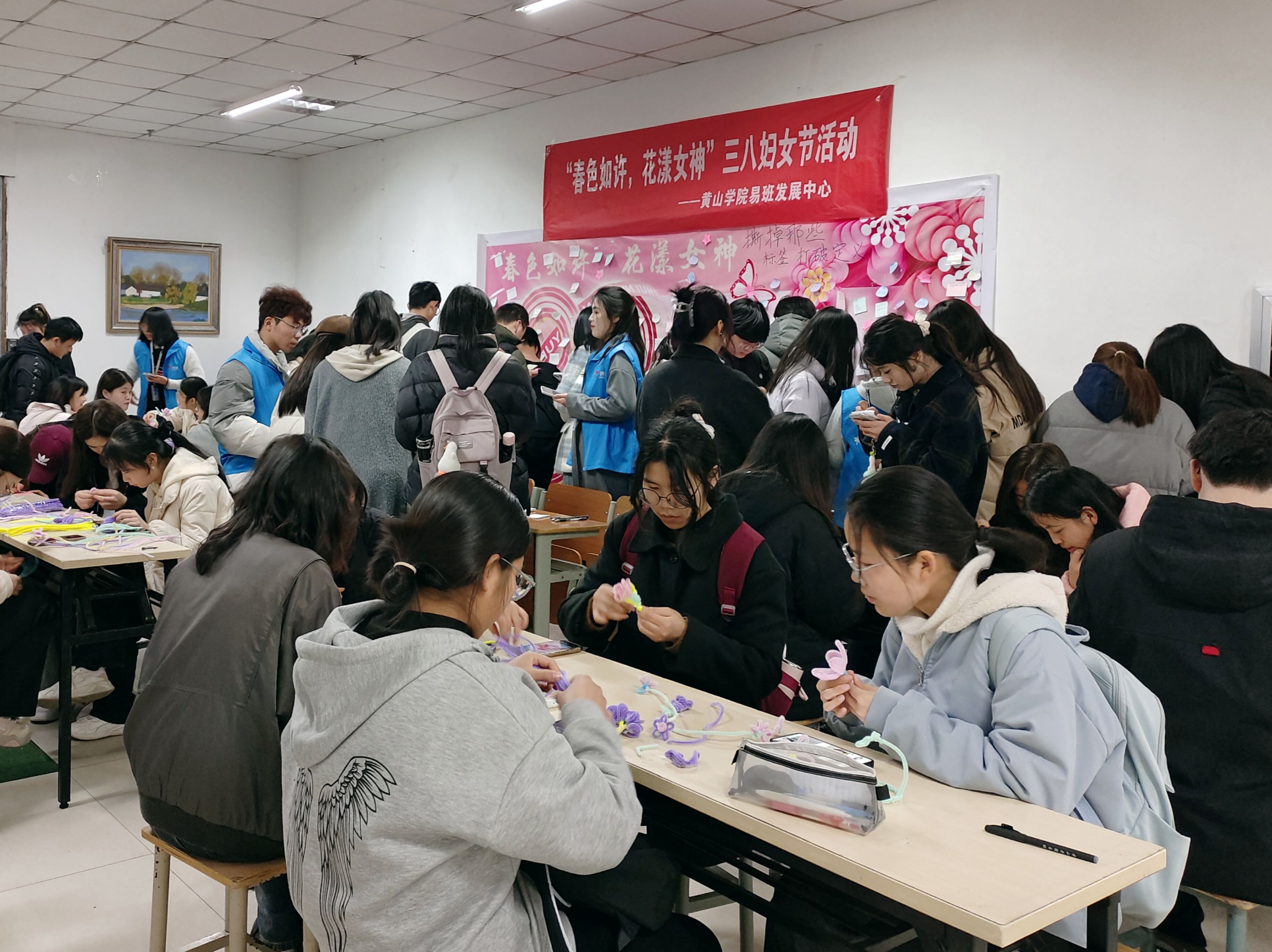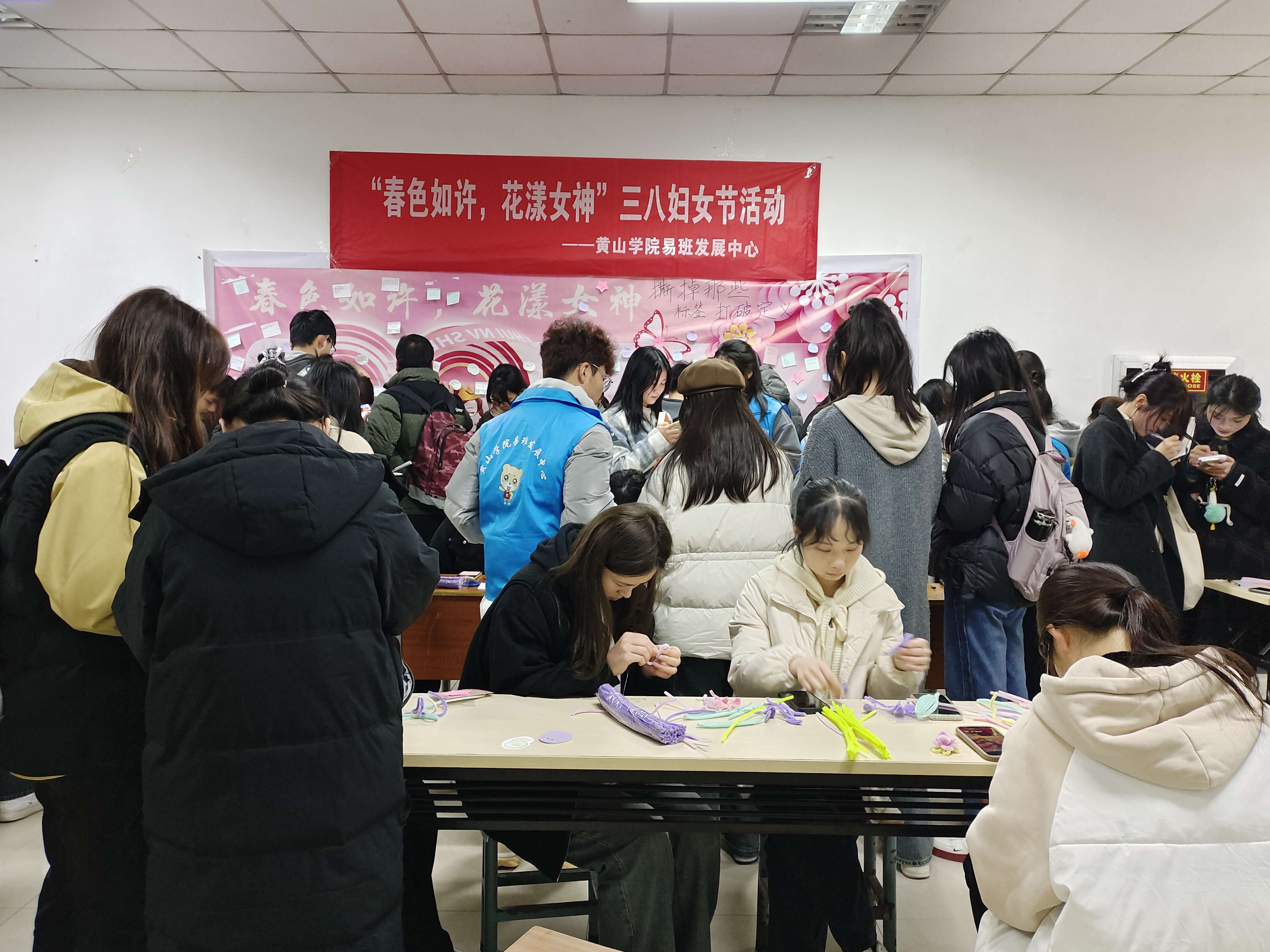 线下活动于3月8日下午在图书馆一楼大厅如期举行,参与活动的同学们井然有序地在工作人员处领取便签,写下对妇女节的美好祝愿,对母亲的感激之情;或对自己的期许和对未来的憧憬;并将便签粘贴在活动海报上,留下了节日的足迹。在活动现场,中心工作人员还向大家展示了由扭扭棒制作的手工花作品,引发了同学们浓厚的兴趣。在工作人员的耐心指导下,同学们热情高涨,交流热烈。他们根据自己的喜好挑选材料,搭配色彩,按照教学视频中的步骤,通过“折”、“扭”、“剪”、“粘”等手法,精心制作出一朵朵栩栩如生的花朵,如郁金香、玫瑰花、康乃馨、萱草花等。此外,同学们还发挥想象力和创造力,将扭扭棒制作成蝴蝶结、皇冠等各式造型,以此庆祝节日,令人赞叹。