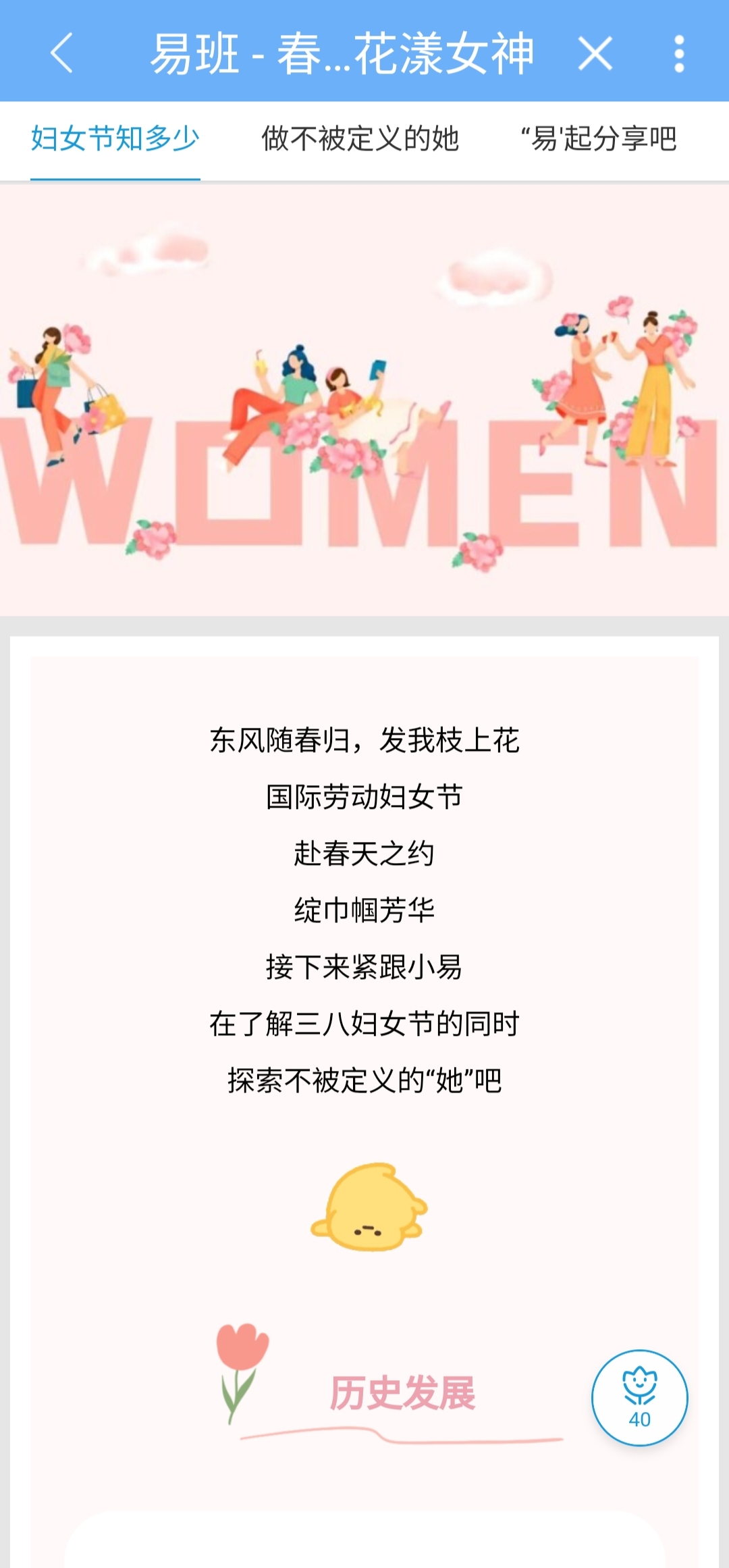 线上活动以易班轻应用为平台,参与者们纷纷浏览“春色如许 花漾女神”轻应用,深入了解妇女节的起源和历史,感受女性的多元化。他们在评论区积极留言,分享对节日的祝福和对女性的美好期望。同时以#春色如许,花漾女神#为话题发布易瞄瞄,将这份美好的祝福分享给更多的人,取得了显著的活动效果。