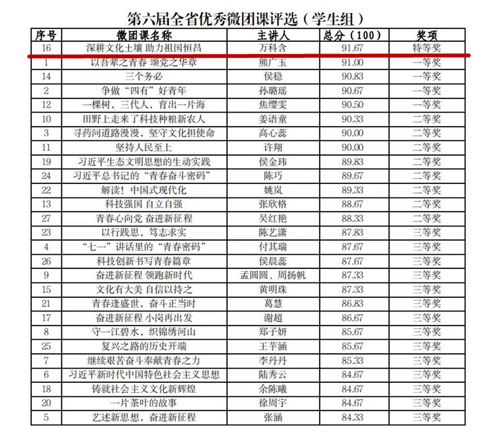 近日,由共青团安徽省委主办的第六届全省优秀“微团课”评选活动在合肥成功举办。经过激烈角逐,文化与传播学院学生万科含荣获学生组特等奖,充分展示了我校共青团员的良好风采。 此次全省微团课评选活动旨在深入学习宣传贯彻党的二十大精神,贯彻落实习近平总书记关于青年工作的重要思想。本次活动自2023年9月启动,校团委高度重视,通过举办校内微团课、微视频大赛,遴选优秀选手和作品,切实提升团员青年理论宣讲能力。 下一步,学校将继续深入学习宣传贯彻党的二十大精神,挖掘更多具有丰富内涵、受同学们喜爱的思政素材,营造创新团课形式的良好氛围,全方位助力全校师生积极参与到团课活动中。努力培养能堪当民族复兴重任的新时代青年,让青春芳华在与祖国发展的同频共振中熠熠生辉。