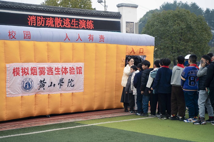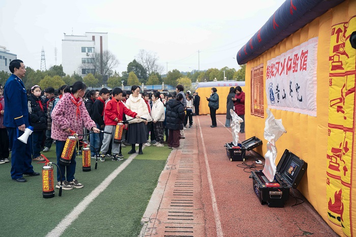 活动中,支部党员在龙山实验小学操场搭建了模拟烟雾逃生体验馆和模拟灭火体验馆,运用仿真模拟设备进行火场疏散逃生演练和灭火实战培训。在培训演练现场,党员对龙山实验小学师生进行了消防安全知识科普,对逃生和灭火要点进行详细讲解,指导教职工、同学们有序进入体验馆亲身感受火灾场景,使用电子灭火器模拟扑灭初起火灾,演练快速疏散逃生。通过寓教于乐的模拟演练,进一步深化了师生对消防知识的了解。