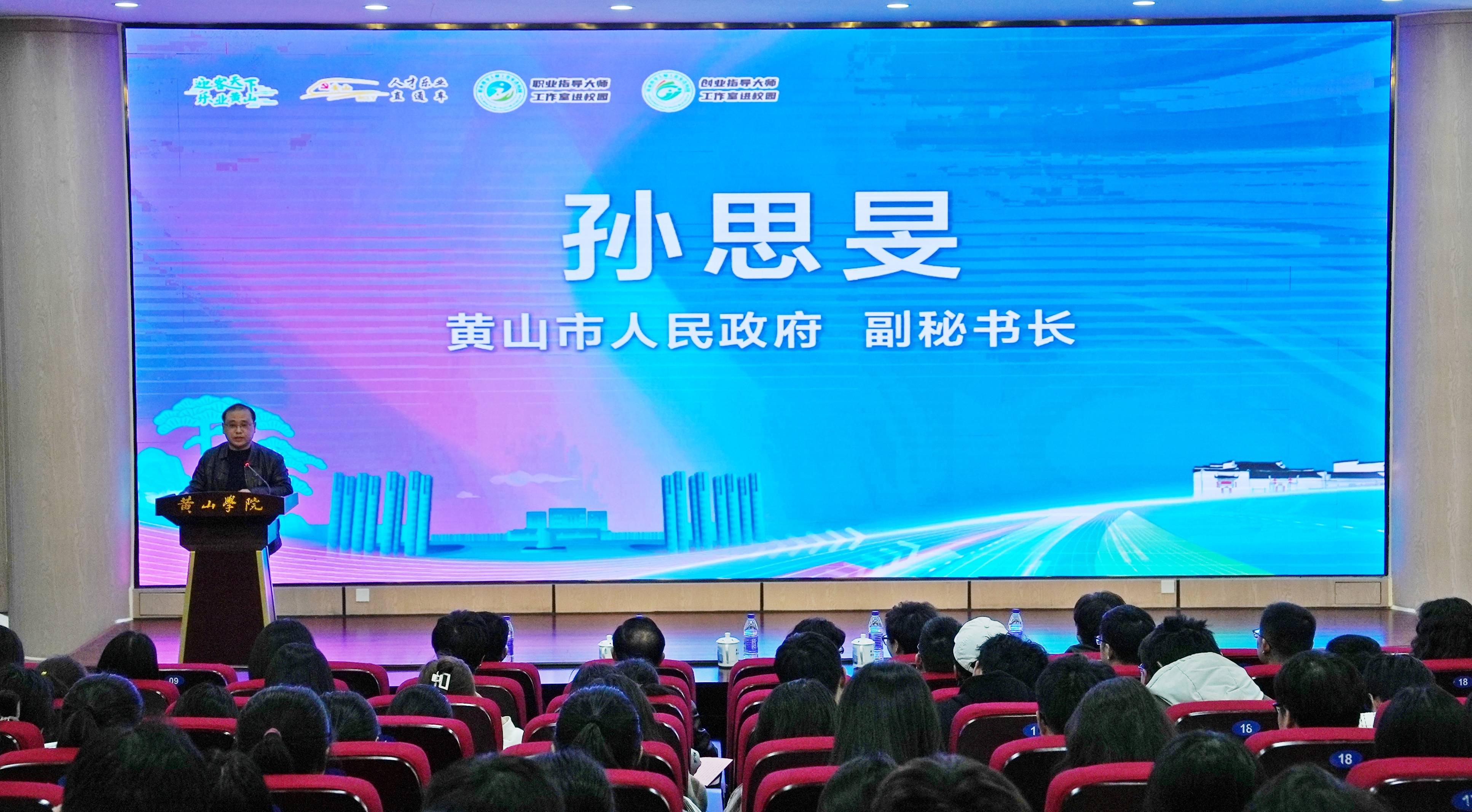 孙思旻高度评价了黄山学院为黄山市经济社会发展做出的贡献,并从历史沿革、文化底蕴、科技创新、人才政策等方面向我校学子们展示了黄山的发展机遇和良好的人才政策,诚邀同学们用自身的智慧和能量投身黄山、建设黄山、筑梦黄山,把自己的梦想与中国梦、黄山梦高度融合起来、有机衔接起来,努力实现青年成长与黄山发展的双向奔赴、彼此成全。