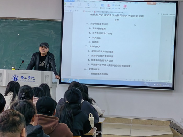 3月19日,艺术学院在文澜楼405-406教室举办新安艺术讲坛本学期第一讲。讲座由浙江师范大学艺术学院张艺教授主讲,讲座的题目是《传统和声语言背景下的钢琴即兴伴奏创新思维》。本次讲座由艺术学院副院长史一丰主持。21级音乐学全体学生和键盘、作曲专业教师100余人聆听了讲座。